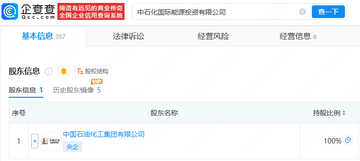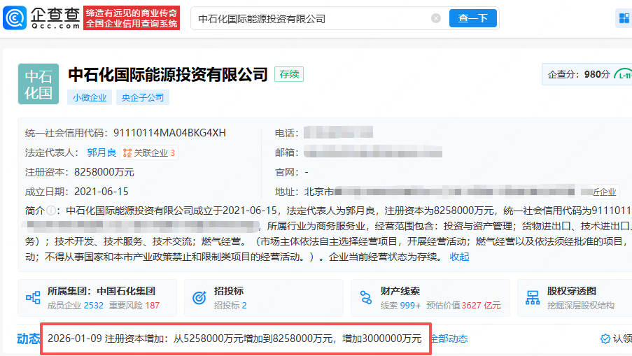 中石化国际能源投资有限公司发生工商变更,注册资本从525.8亿元增加到825.8亿元,增幅约为57.06%。企查查显示,中石化国际能源投资有限公司成立于2021年6月,法定代表人为郭月良,经营范围包含:投资与资产管理;货物进出口、技术进出口、代理进出口;经济贸易咨询(不含中介服务);燃气经营等,由中国石油化工集团有限公司全资持股。